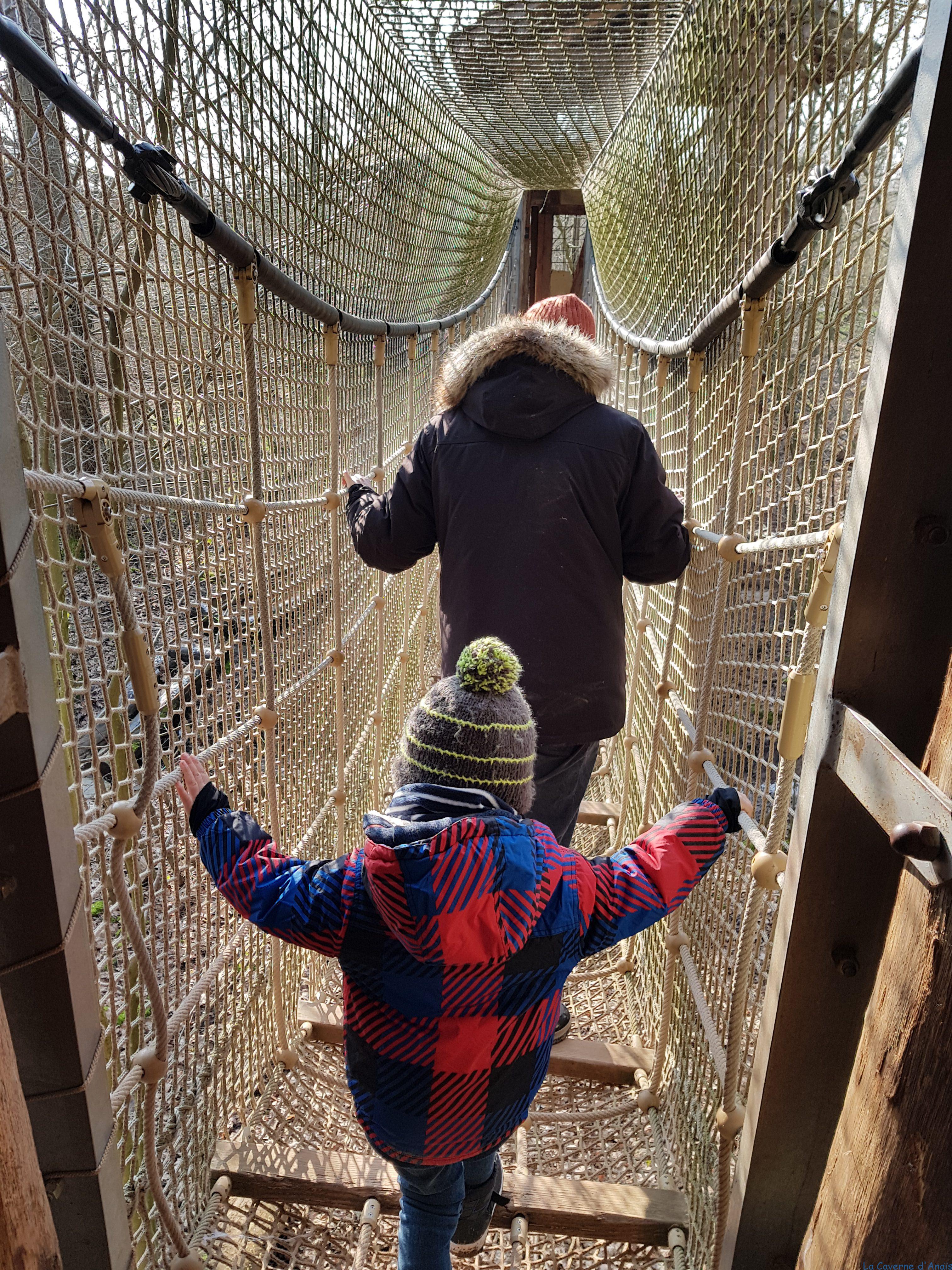 Le parc est répartit en 3 sentiers dont celui très sympathique prénommé le voyage de Noé qui est un sentier dédié à la biodiversité mondiale et qui permet d’aborder les grandes problématiques environnementales actuelles à travers de nombreuses aventures ludiques et pédagogiques adaptées aux enfants. Théophile a vraiment adoré cette partie qui lui a donné l’impression de partir en exploration. Malheureusement, à cette période une grosse partie de ce parcours est fermée telle que le parcours pieds nus ou le voyage en pirogue mais nous avons pu faire par exemple la partie « cabanes dans les arbres » qui nous a permis d’avoir une belle vue sur les pandas roux.